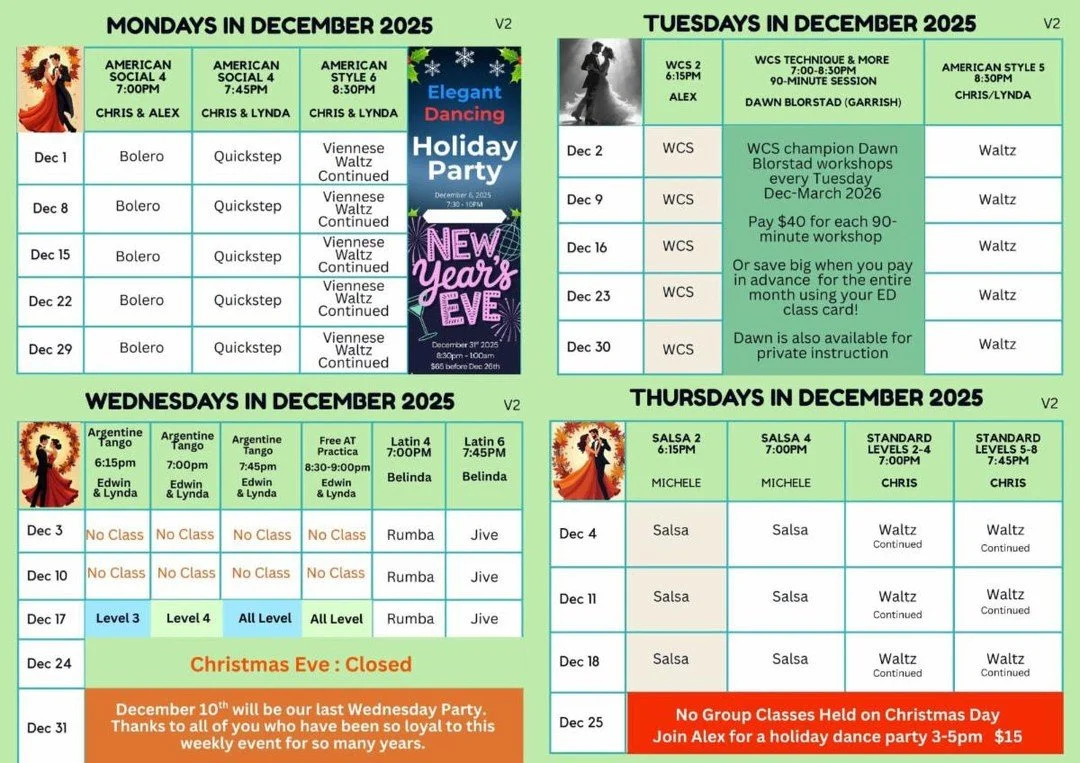 Elegant Dancing helps beginners progress from their first box step to any level of social or competitive dancing. With 15 experienced instructors, we provide a fun and efficient dance journey tailored to your goals. No contracts or pressure—just expert instruction from passionate teachers!