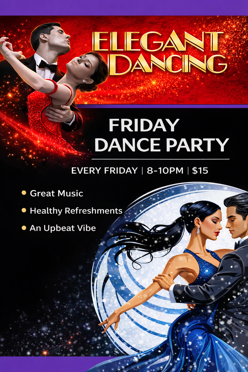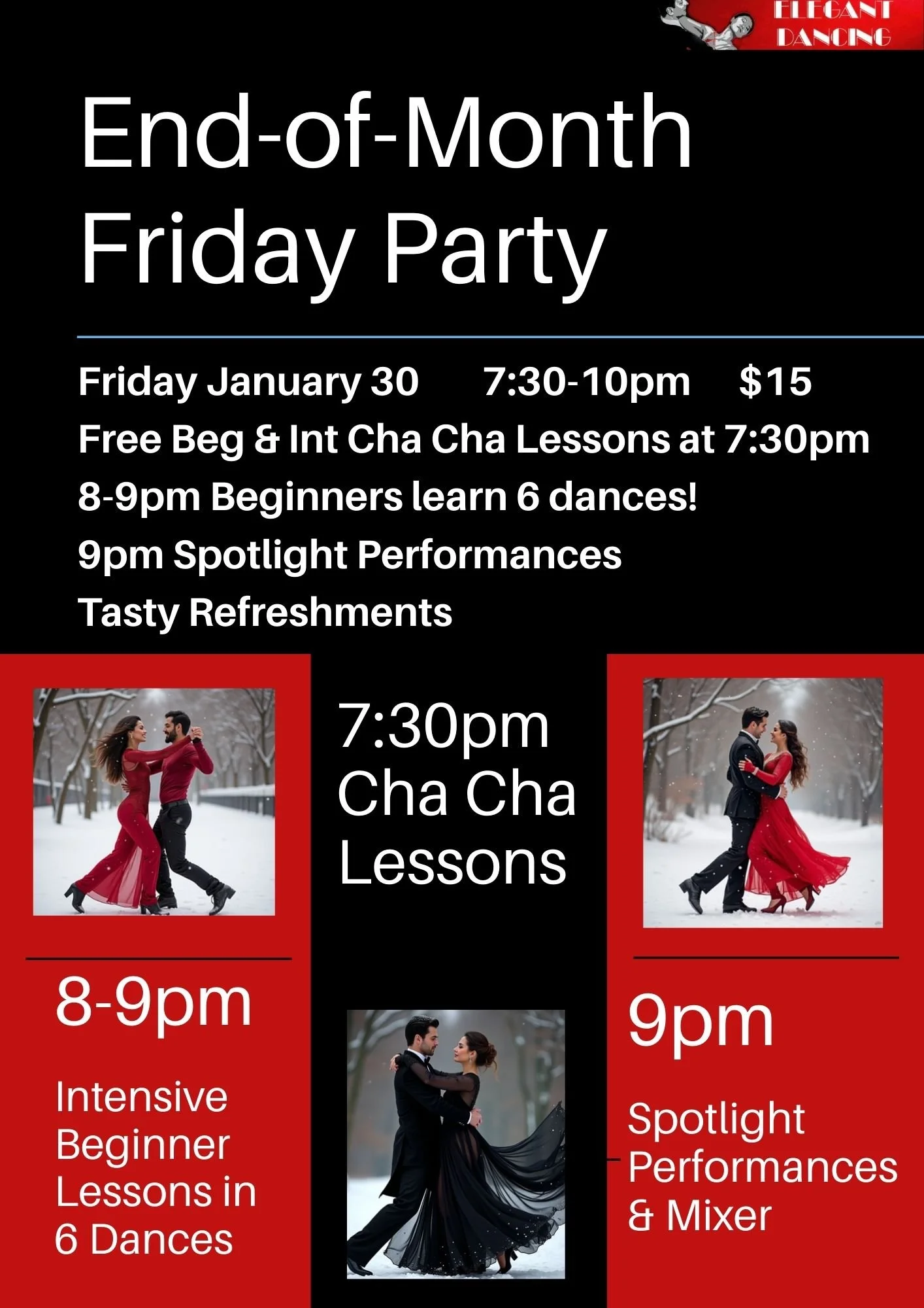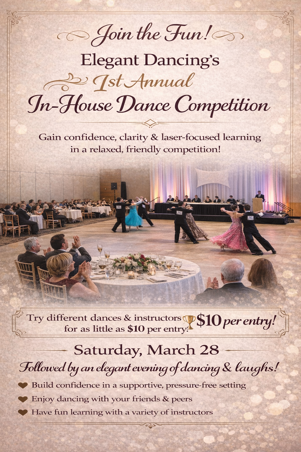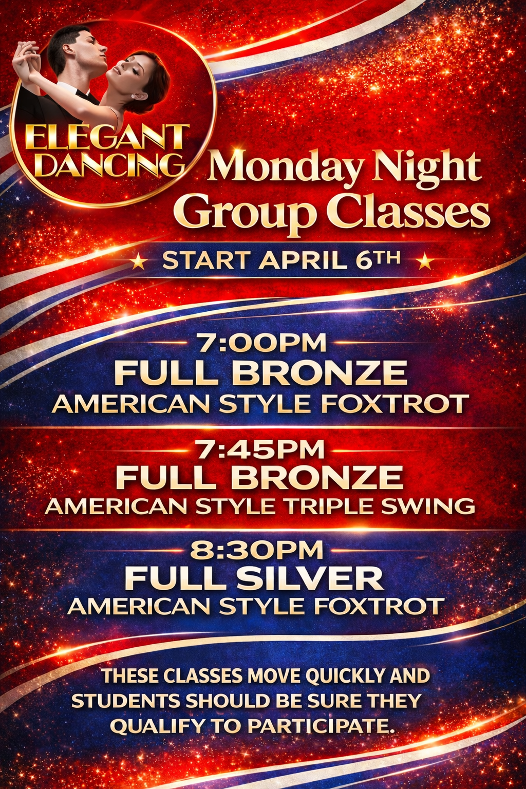 Elegant Dancing helps beginners progress from their first box step to any level of social or competitive dancing. With 15 experienced instructors, we provide a fun and efficient dance journey tailored to your goals. No contracts or pressure—just expert instruction from passionate, experienced teachers!