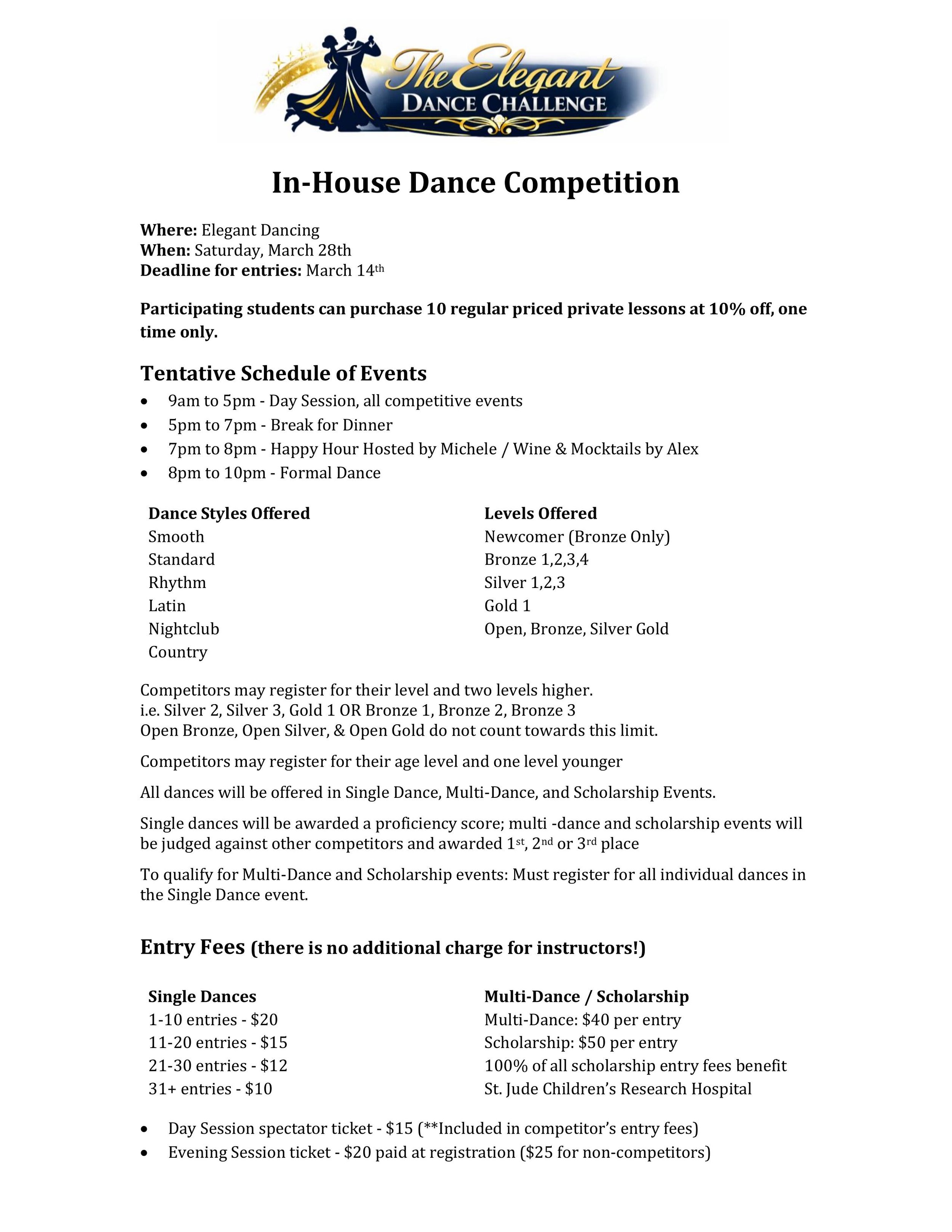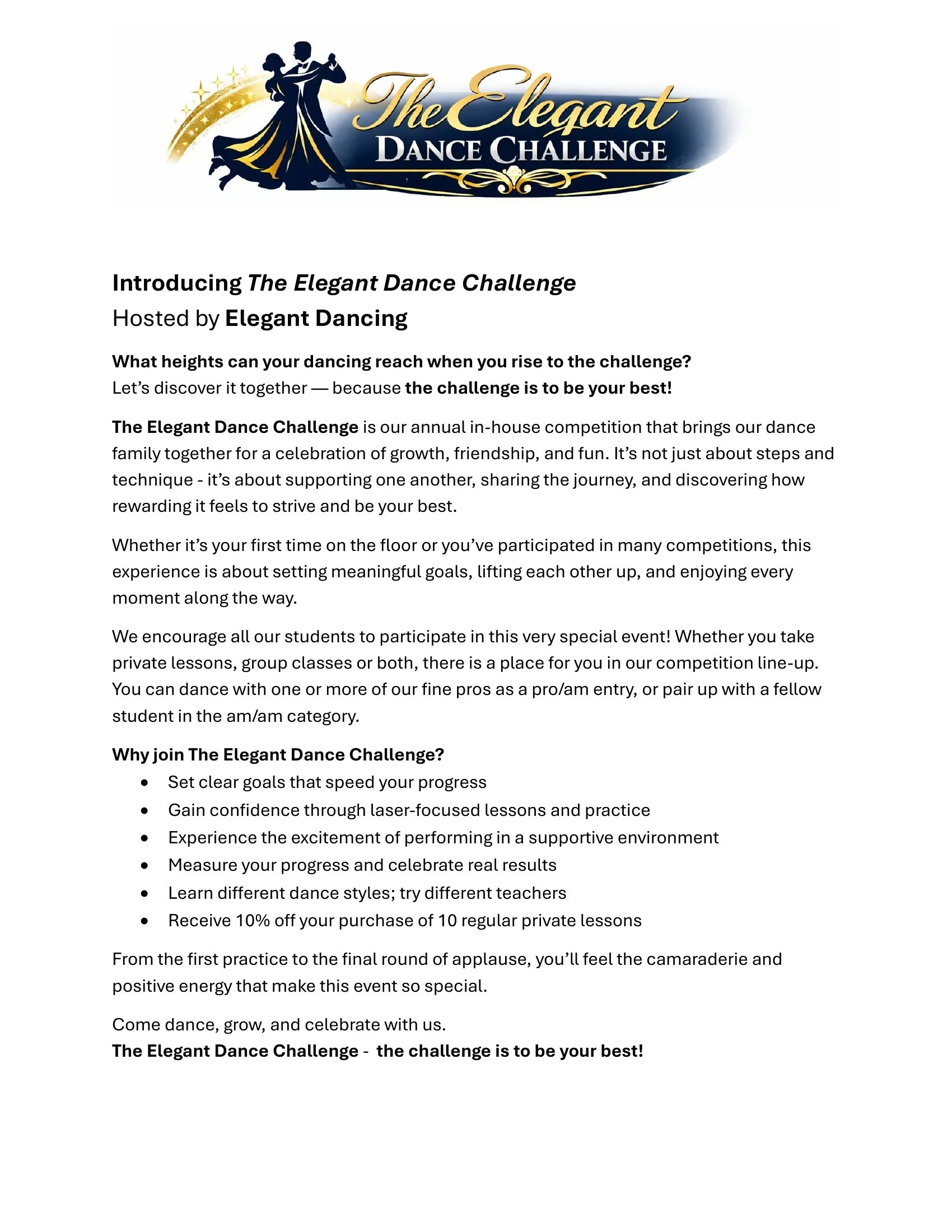 The Elegant Dance Challenge is our own In-House Dance Competition, exclusively for Elegant Dancing Group and Private Students. Whether you’re new to dancing or a seasoned competitor, we urge you to join us for this fun day of quality dancing. Pro/am, am/am single and multi-dance events are available in all styles - International, American, Country and Club styles.