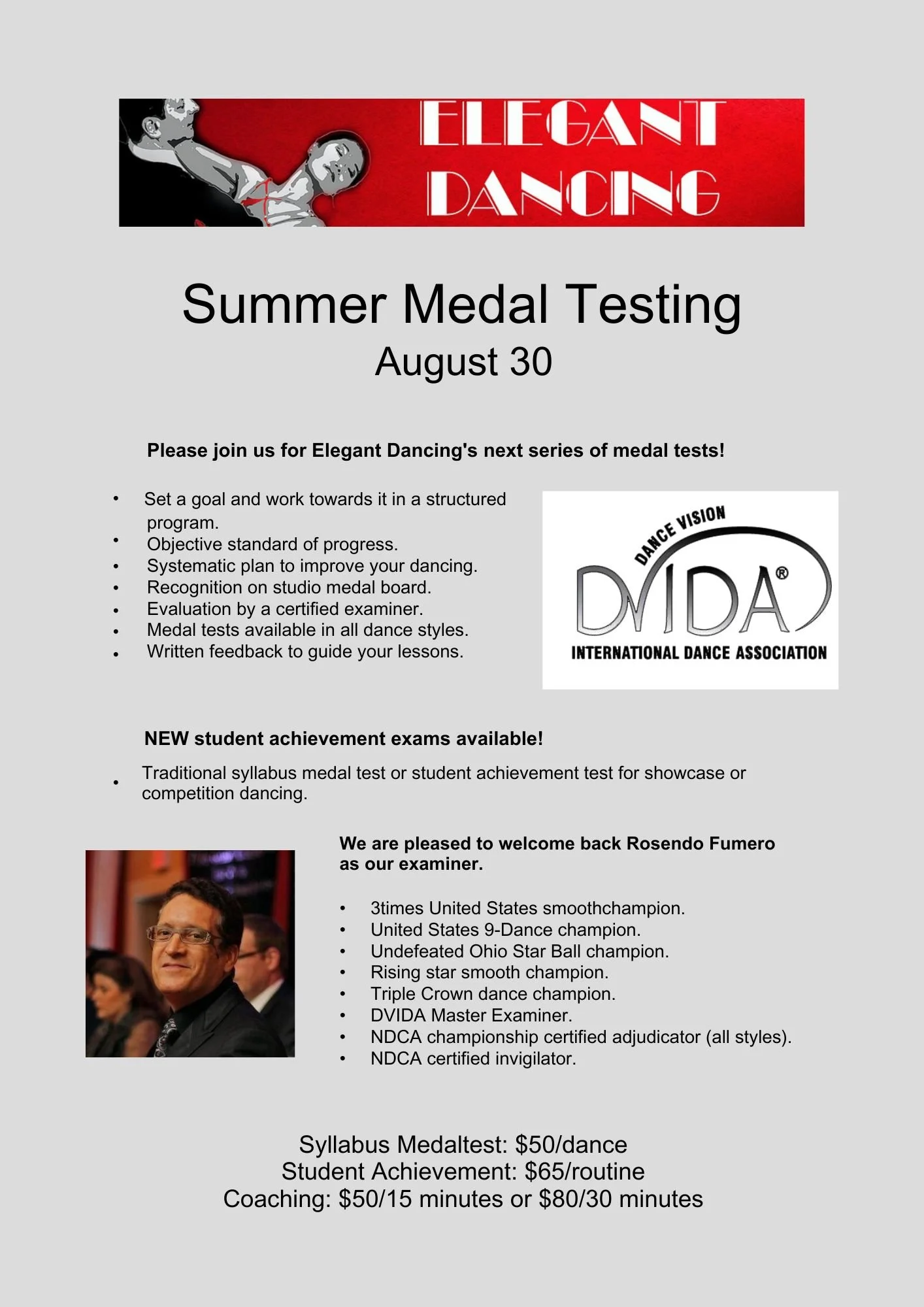 On the day of the test, you will dance with your teacher or amateur partner, while one of the highly qualified DVIDA Examiners observes, evaluates, and makes written comments to help guide your future lessons. You may want to take a short coaching session with the Examiner after your test. These "mini-coachings" maximize the benefits of the testing experience. Successful candidates will receive a certificate and award. Medal Testing provides a graduated series of goals similar to examinations given to academic students.