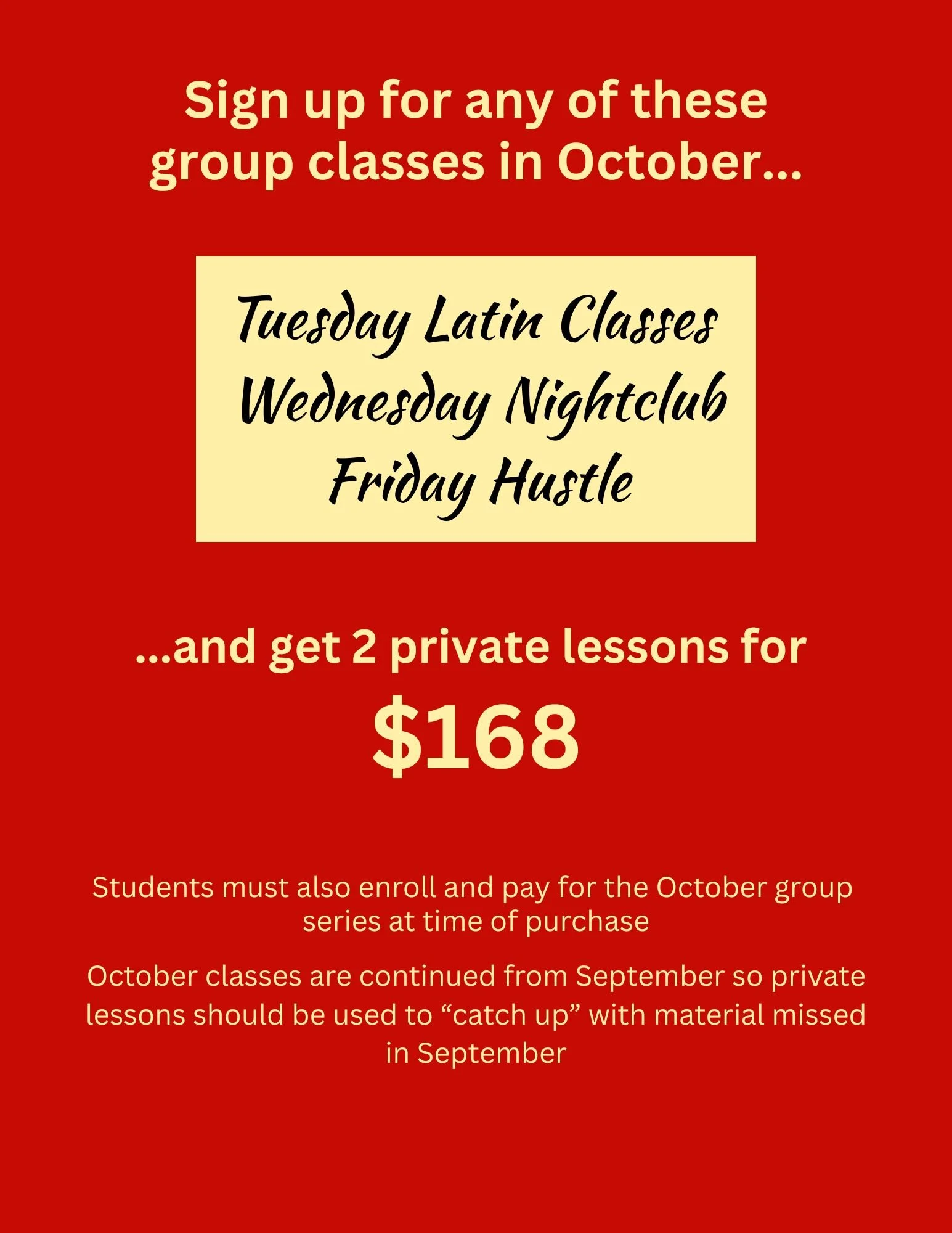 Enroll in Tuesday Latin classes with Belinda, Wednesday Nightclub with Malin & Mariel, or Friday Hustle with Alex and get two 45-minute private lessons in the same dance for only $168.