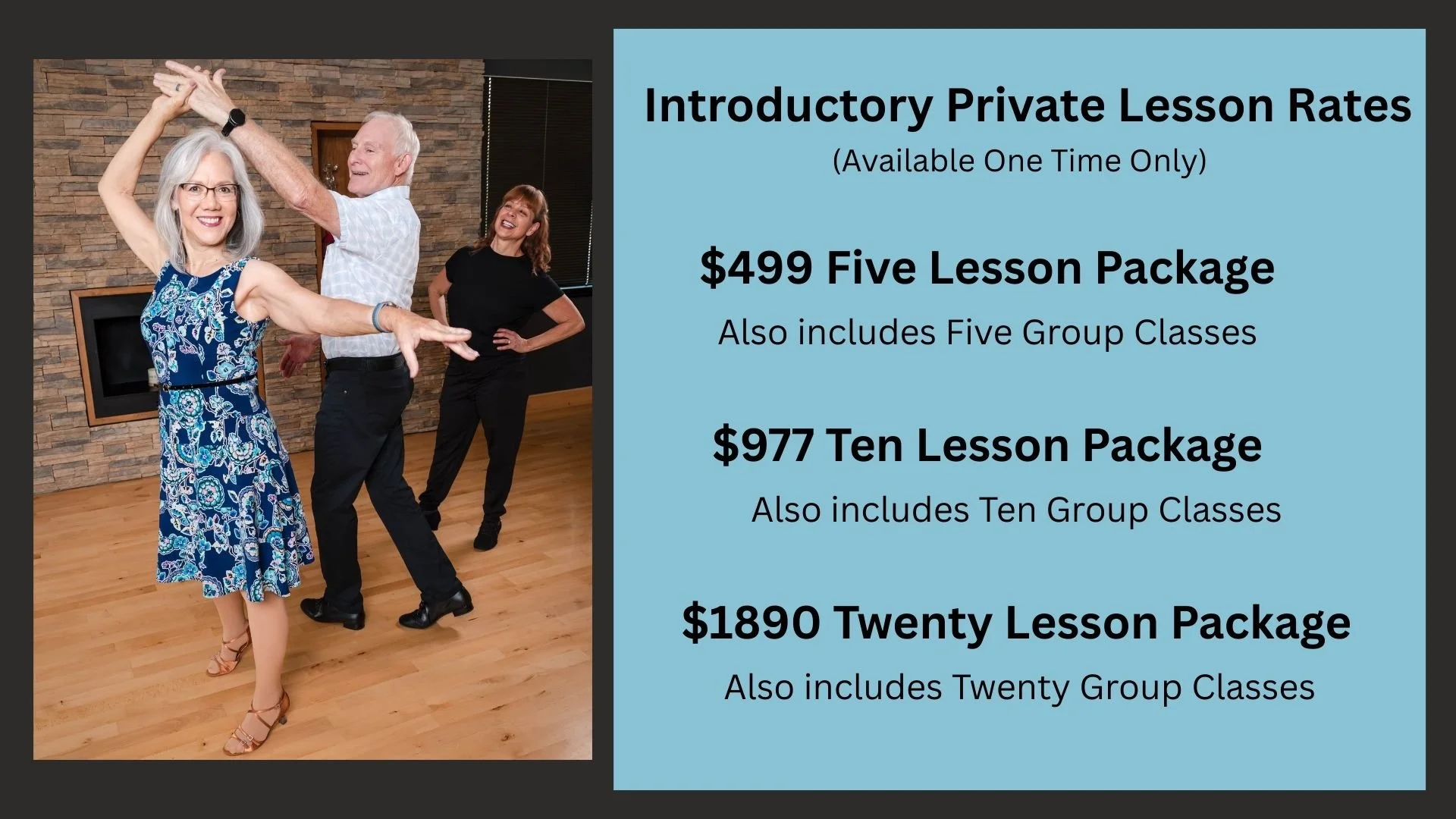 Taking lessons solo? Buy private lessons and get an equal number of group classes included with your purchase. Taking lessons as a couple? Buy private lessons and get an equal number of group classes for each of you!
